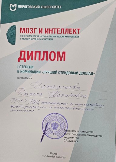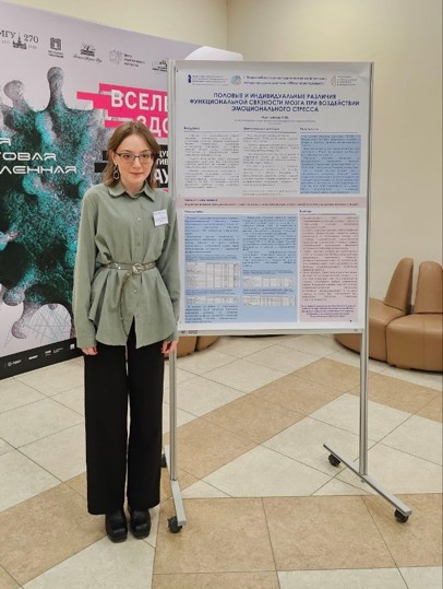 Высокой оценки жюри удостоилось ее исследование на актуальную тему:«Половые и индивидуальные различия функциональной связности мозга при воздействии эмоционального стресса», представленное в формате стендового доклада.