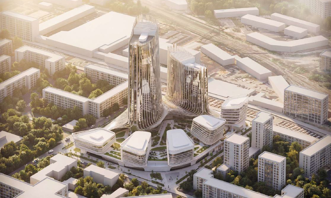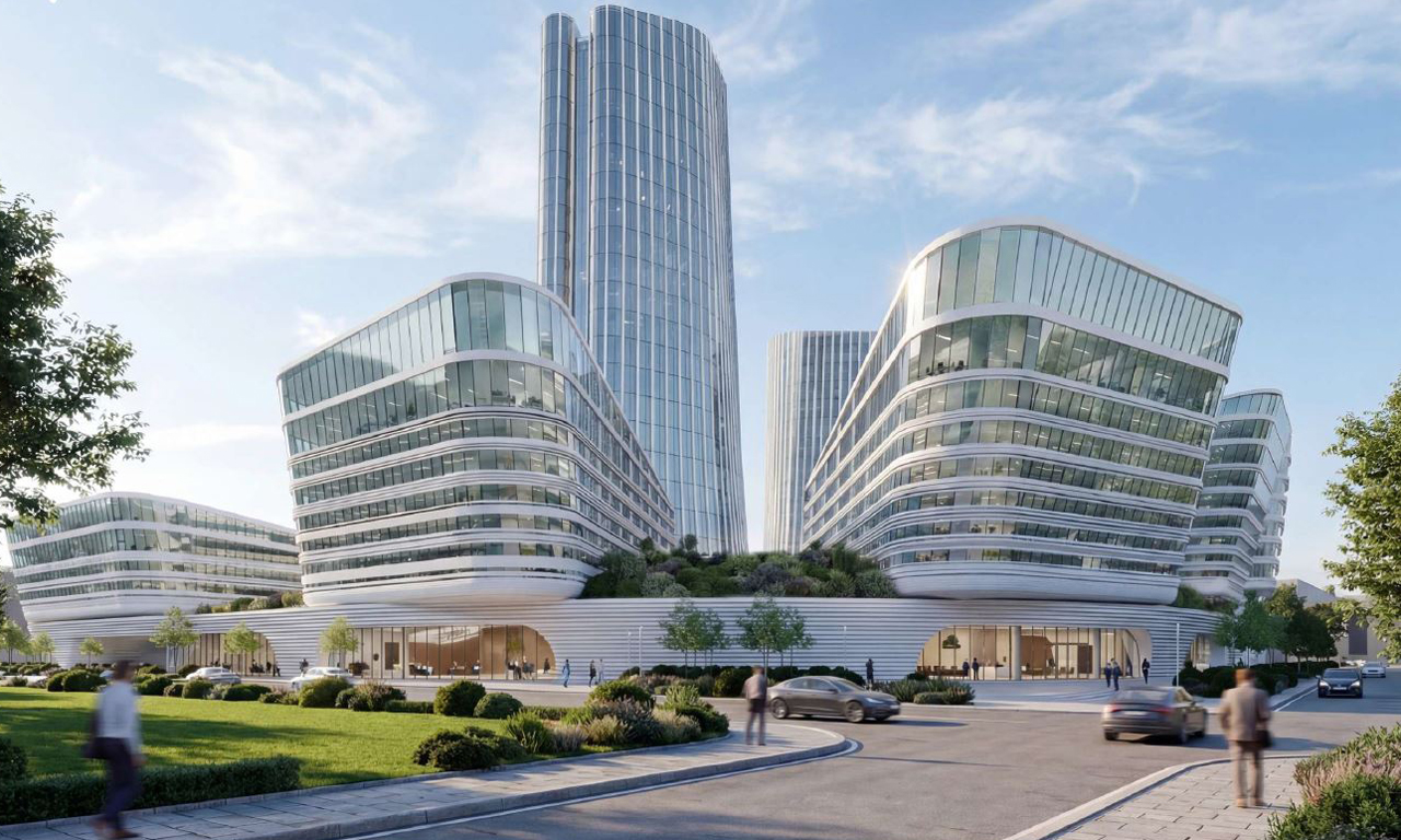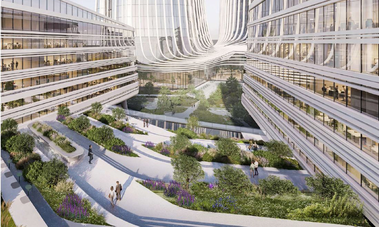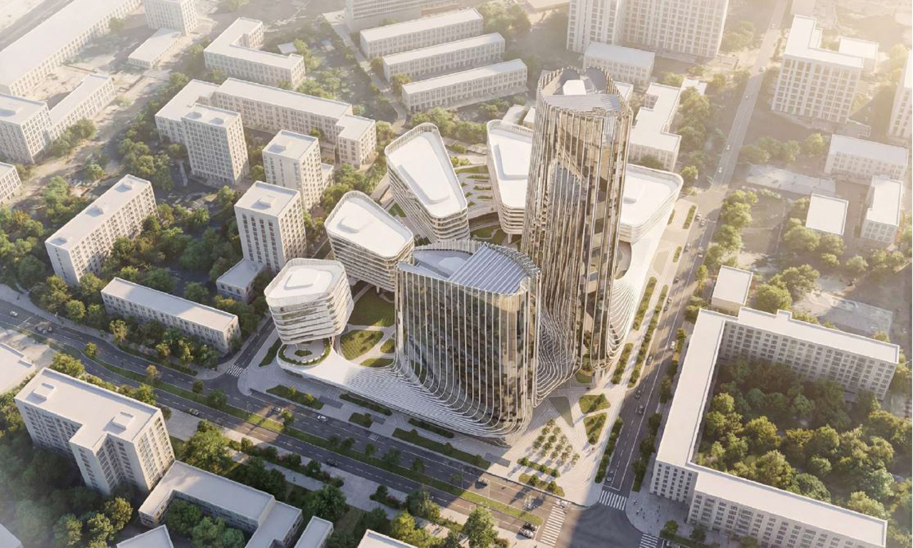 Согласно проекту, возведут семь корпусов, сгруппированных вокруг центрального двора. На первом этаже их объединит сквозная стеклянная галерея с общественными пространствами. Высота корпусов первой очереди варьируется от 23 до 50 метров, фасады выполнены светопрозрачными. Композицию венчают две башни второй очереди — 95 и 149 метров. Архитектурное решение базируется на принципе квартала-кампуса: застройка идёт по периметру участка, объединяясь стилобатом с эксплуатируемой кровлей. Общая площадь комплекса составит 131 тысячу квадратных метров, сметная стоимость — 51,2 миллиарда рублей, а срок реализации — около десяти лет.