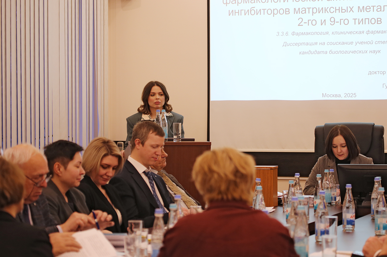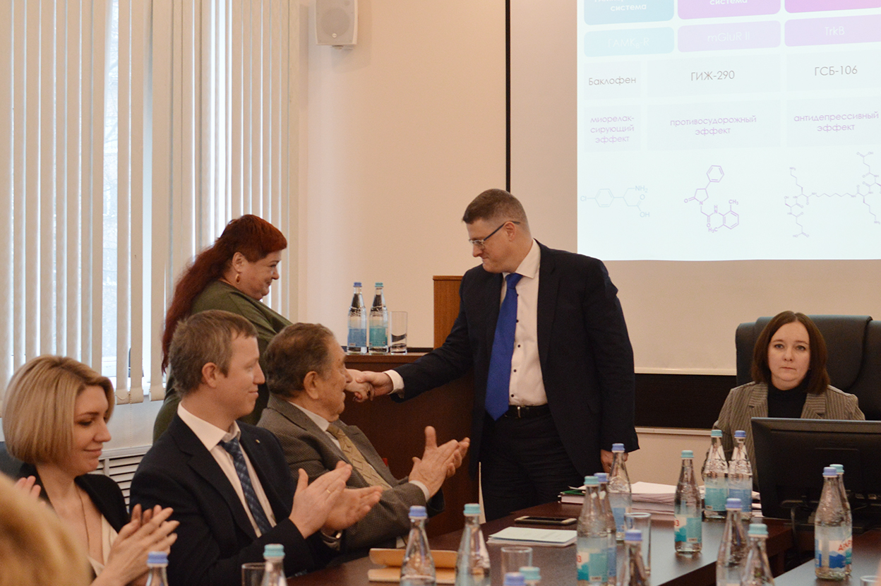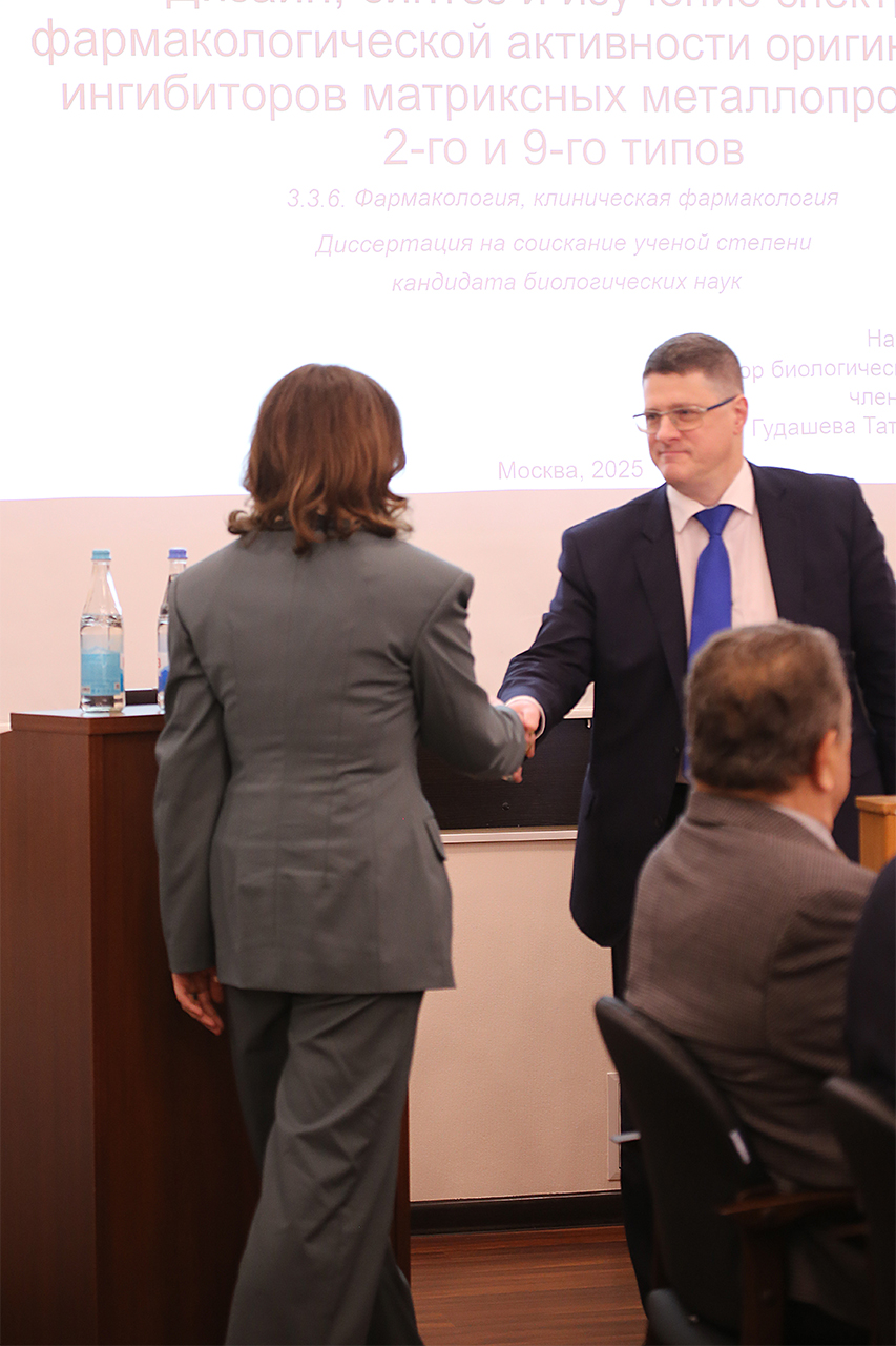 • Григоркевич Оксана Сергеевна, диссертация «Дизайн, синтез и изучение спектра фармакологической активности оригинальных ингибиторов матриксных металлопротеиназ 2-го и 9-го типов» на соискание ученой степени кандидата биологических наук по специальности 3.3.6 «Фармакология, клиническая фармакология», научный руководитель – доктор биологических наук, профессор, член-корр. РАН Гудашева Татьяна Александровна.