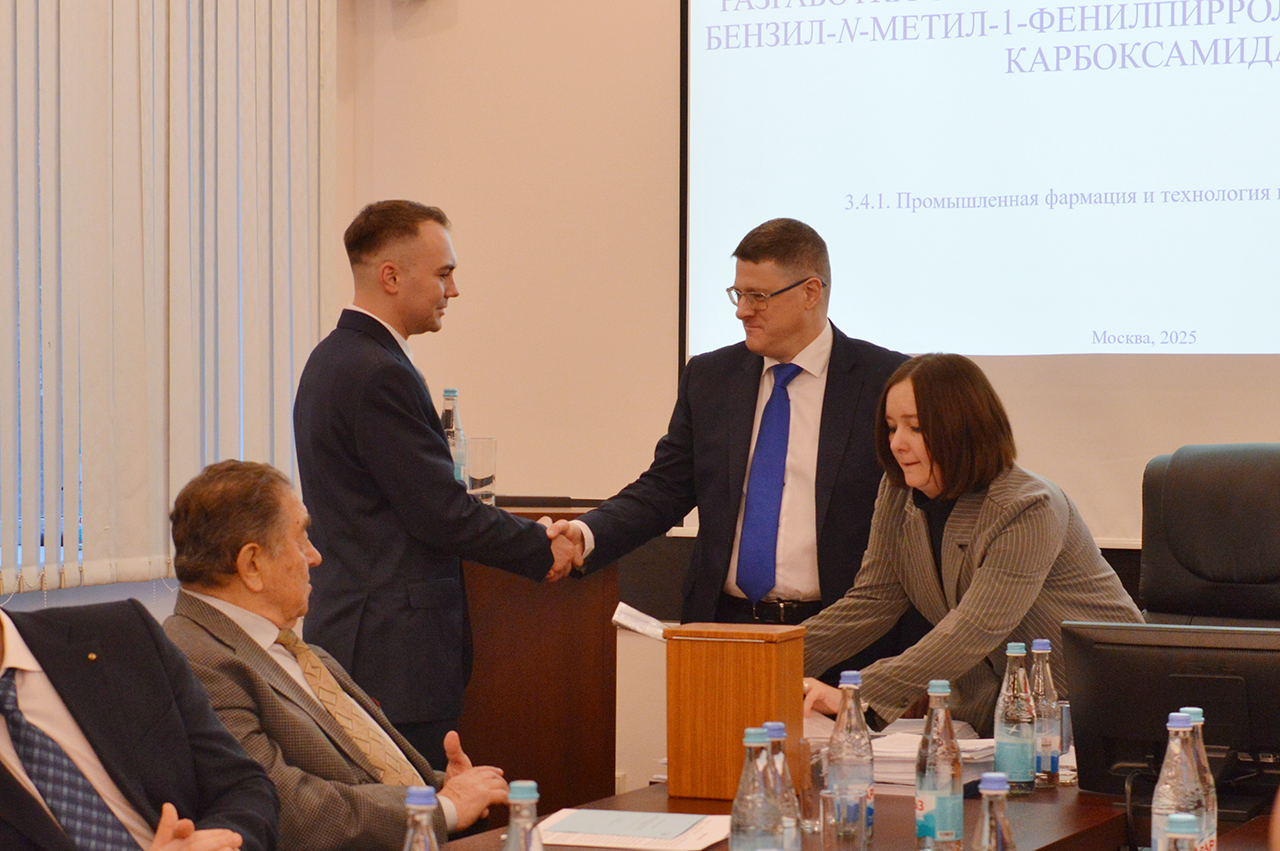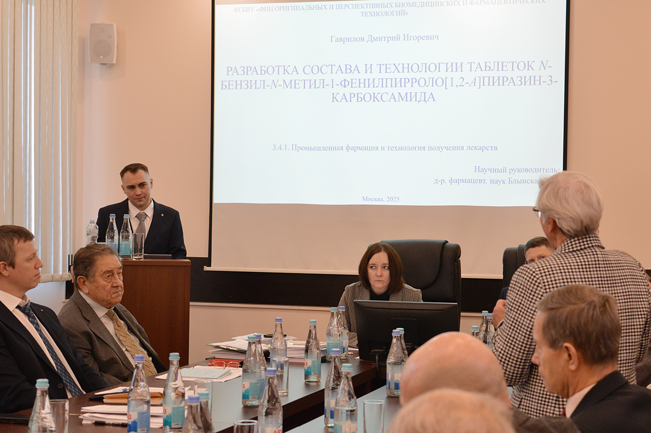 • Гаврилов Дмитрий Игоревич, диссертация «Разработка состава и технологии таблеток N-бензил-N-метил-1-фенилпирроло[1,2-а]пиразин-3-карбоксамида» на соискание ученой степени кандидата фармацевтических наук по специальности 3.4.1 «Промышленная фармация и технология получения лекарств», научный руководитель – доктор фармацевтических наук Блынская Евгения Викторовна;